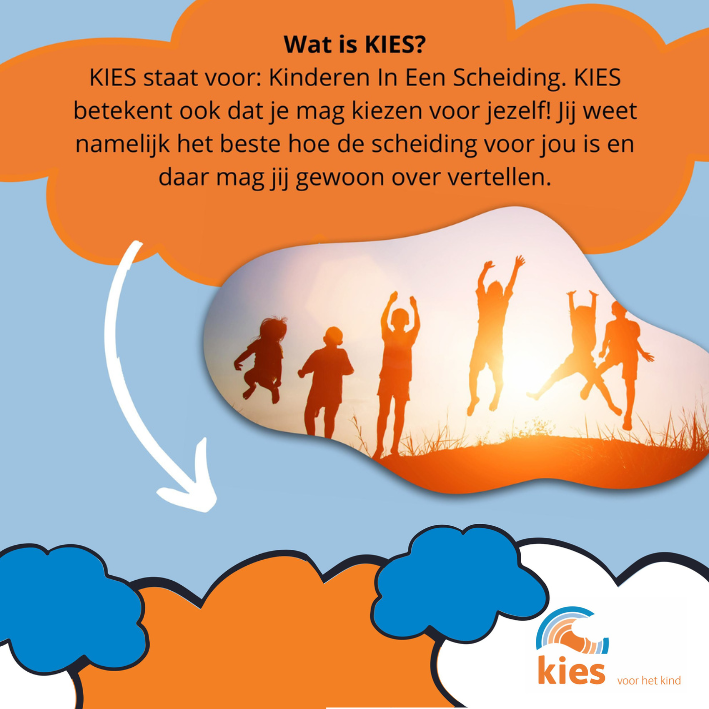 Kinderen kiezen niet voor een scheiding; het overkomt hen. Hoe ze omgaan met de situatie verschilt per kind. In de KIES-groep leren kinderen de scheiding beter begrijpen, een plek geven en omgaan met alles wat lastig is. De training bestaat uit acht bijeenkomsten van 1 uur in een kleine groep. Onder begeleiding van speciaal getrainde begeleiders leren kinderen praten over hun gevoelens, oplossingen bedenken voor lastige situaties en samen ervaringen delen.